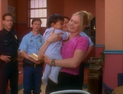 Anyway, while the baby is sleeping after Tommy puts him to bed, the Boohoo monster arrives to put a spell on baby Joey to amplify his the volume of his crying. The next day at school, when he starts to cry, it creates an earthquake. When the rangers realize it's the baby crying that causing the quake, they make him stop while Tommy and Billy go to the Power Chamber and find out a way to reverse the spell. While Kat and Rocky take care of the baby, Tanya and Adam arrive outside and almost wake up the baby. When the rangers and the baby are confronted by the Boohoo monster and a squad of Cogs, the rangers alert Tommy and he teleports there to morph with them. After a quick morph sequence (Boooooo!!!!), the rangers begin their fight against Boohoo monster and the Cogs while Alpha teleports there to watch Joey. But during the fight, the Cogs capture Joey and power down Alpha.
