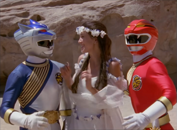 So here we are at the penultimate episode of the season as the rangers continue to look aimlessly for Princess Shayla and getting one last glimpse of the Wild Forced Rider (Stupid toy marketing!!! -_-) Meanwhile, Jindrax and Toxica are planning to hide from Master Org's radar when Toxica learns he still has the Princess, which means if he has her necklace then he'll have enough power to find them anywhere and destroy them. So in a last minute decision of desperation to protect themselves, the two Duke Orgs confront the rangers and make a deal with them to help them save the Princess. At least the rangers here are more skeptical of their help, especially considering last time Jindrax tricked them so nice there that the rangers are actually learning. So apparently, Jindrax and Toxica know where the Nexus is but only Orgs can navigate it and gain entry. Unfortunately, Master Org has put a forcefield over the Nexus that can only be destroy by destroying 3 statues that protect the Nexus. Toxica tells them to look for the 3 pillars of light to find the statues but to be careful as they are very likely to be guarded. After an uneasy agreement to their alliance, Toxica and Jindrax head for the Nexus while the rangers morph, split into teams and head out to find the statues.
