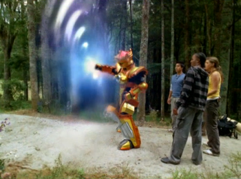 Whatever!!! Rose and Tyzonn find the seal for the force field, Rose destroys the seal while Tyzonn gets his ass defeated to where he's unconscious but Rose suddenly acts like she just lost her husband; running over and crying over him like he's dead. Girl, this guy served being turned to liquid and was resurrect by two jewels....you two have just made a breakthrough in some resemblance of a friendship, excuse me but shut up. Just...Shut. UP!!! O_O Anyway, she morphs and the rangers arrive in time to save her from the giant robot. I love how one of the Fear Cats says, "Those power rangers never give up!!!"